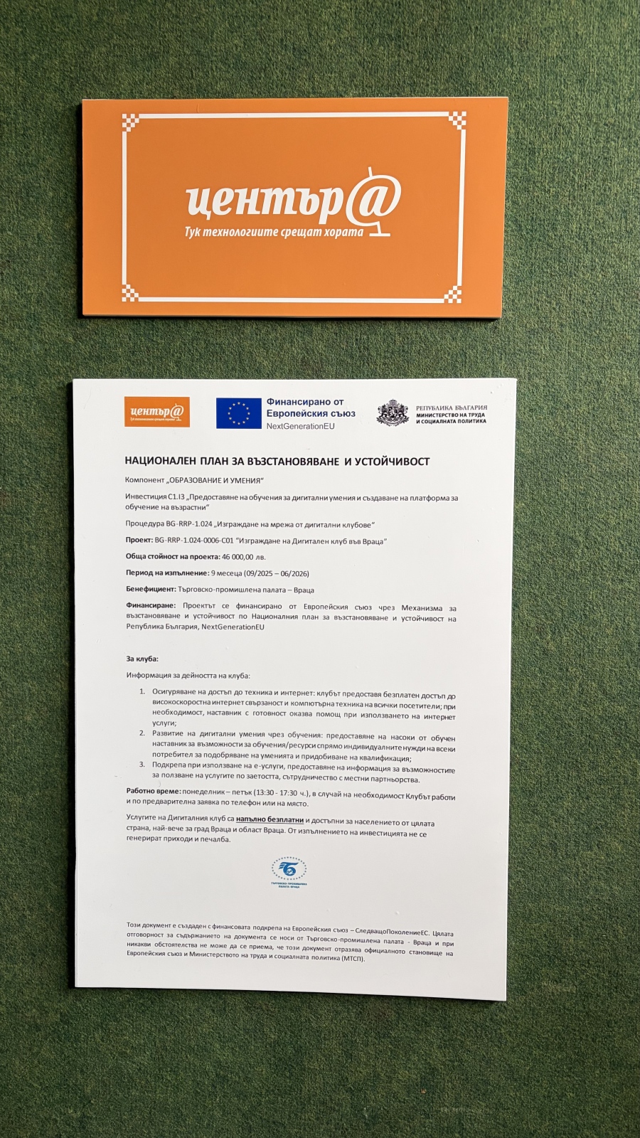 Търговско-промишлена палата – Враца откри Дигитален клуб във Враца – модерно и достъпно пространство за всички граждани, които искат да развиват дигиталните си умения. Проектът „Изграждане на Дигитален клуб във Враца“, BG-RRP-1.024-0006-С01, е финансиран от Европейския съюз чрез Механизма за възстановяване и устойчивост по процедура BG-RRP-1.024 „Изграждане на мрежа от дигитални клубове“, Компонент „Образование и умения“, Инвестиция „Предоставяне на обучения за дигитални умения и създаване на платформа за обучение на възрастни“ от Националния план за възстановяване и устойчивост на Република България, NextGenerationEU. Обща стойност на инвестицията е 46 000,00 лв.