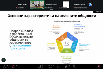 Първата среща, проведена на 17 март 2026 г., беше посветена на концепцията за зелени общности като нов модел за устойчиво развитие на селските и периферните райони. В рамките на събитието бяха представени европейски политики, междинният аналитичен доклад по проекта и редица добри практики от партньорски региони. Акцент беше поставен върху ролята на местните общности като двигател на зеления преход, както и върху необходимостта от интегрирани решения, които свързват икономическото развитие, опазването на околната среда и социалното включване.
