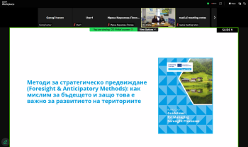 Втората среща, проведена на 20 март 2026 г., надгради темата чрез въвеждане в Методите за стратегическо предвиждане (Foresight & Anticipatory Methods). Участниците се запознаха с подходи за анализ на бъдещи тенденции и разработване на алтернативни сценарии, които подпомагат вземането на стратегически решения в условия на несигурност.