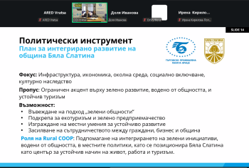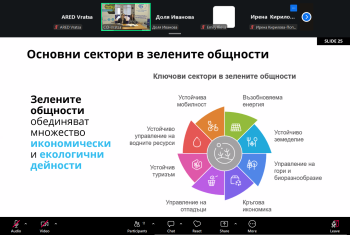 Първата среща, проведена на 17 март 2026 г., беше посветена на концепцията за зелени общности като нов модел за устойчиво развитие на селските и периферните райони. В рамките на събитието бяха представени европейски политики, междинният аналитичен доклад по проекта и редица добри практики от партньорски региони. Акцент беше поставен върху ролята на местните общности като двигател на зеления преход, както и върху необходимостта от интегрирани решения, които свързват икономическото развитие, опазването на околната среда и социалното включване.