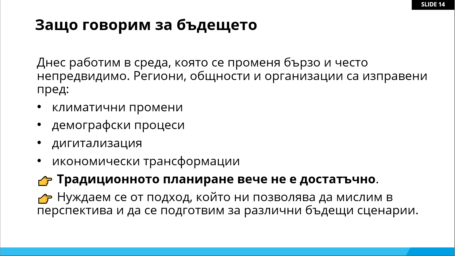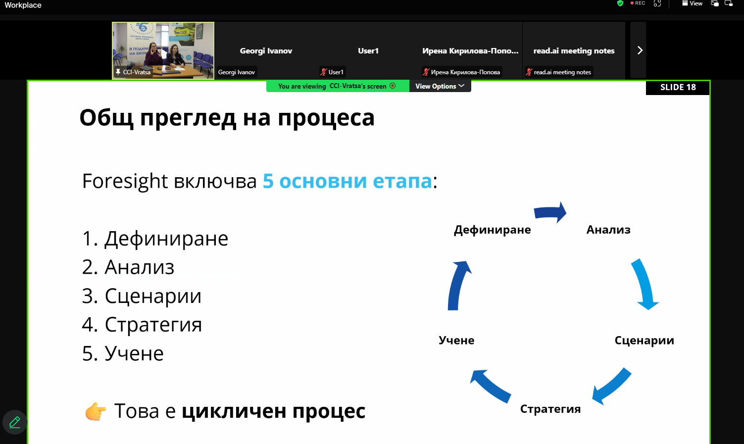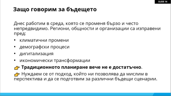 Втората среща, проведена на 20 март 2026 г., надгради темата чрез въвеждане в Методите за стратегическо предвиждане (Foresight & Anticipatory Methods). Участниците се запознаха с подходи за анализ на бъдещи тенденции и разработване на алтернативни сценарии, които подпомагат вземането на стратегически решения в условия на несигурност.